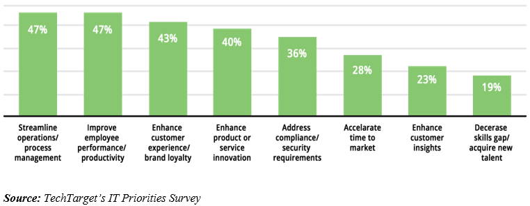 The below-mentioned graph shows the factors driving the digital transformation processes among IT Consulting firms, where streamlining the operations and enhancing customer experience matters significantly.